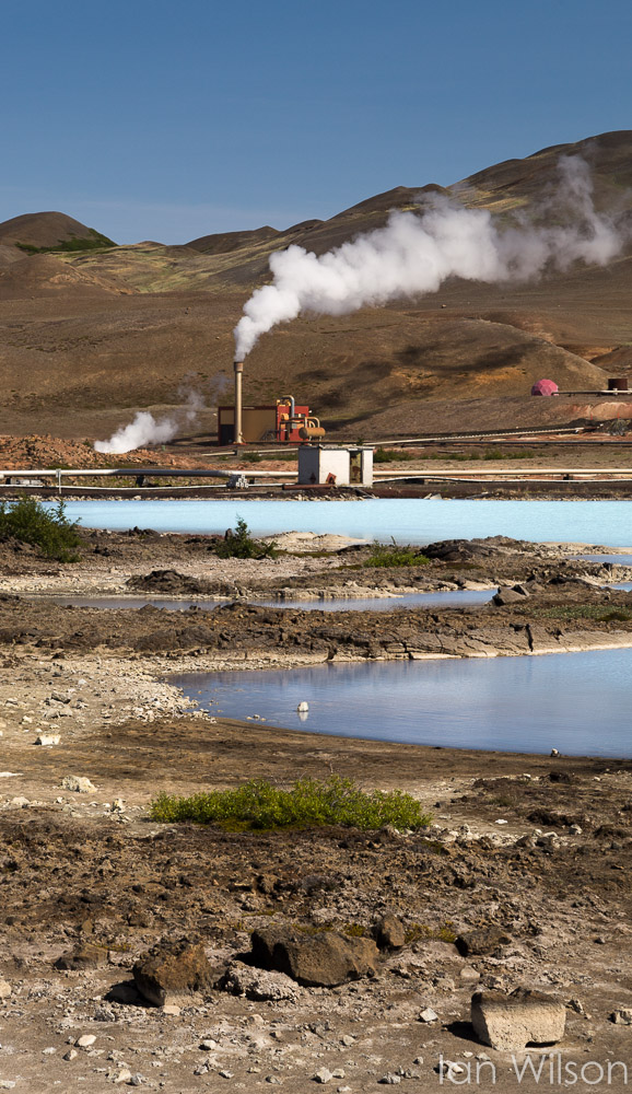 It was then time to bid farewell to Myvatn and head for our next destination: Dettifoss. On the way we passed the same soda lake we'd visited the previous evening, and the pale blue water was shining like a jewel in the sun. Single images just didn't seem to do the area justice, so I tried a full 180 degree, three-row panorama instead. An interesting effect, as the two roads left and right are - of course - one and the same.