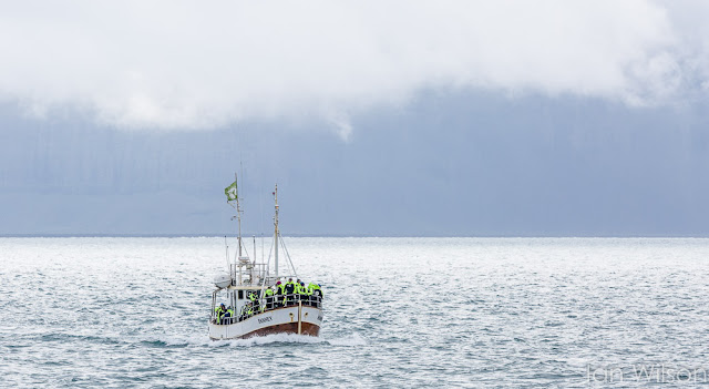 Húsavík used to be the whaling capital of Iceland, but nowadays mainly takes visitors to watch whales rather than attempting to catch them. Some of the tours use inflatable boats, as these can get much closer to the whales; others - who claim to be more eco-friendly by not disturbing the whales - use old Icelandic fishing vessels. Very beautiful they are too, with their polished wood. The one we went out on is at the far right in the second picture.